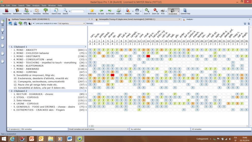 La repertorizzazione è stata effettuata con il software RadarOpus® della ditta Archibel S.A., utilizzando il repertorio Synthesis Treasure Edition 2009V (Schroyens F.). Il metodo di analisi dei dati raccolti, delle osservazioni e della repertorizzazione segue principalmente il Metodo della Materia Medica Viva del Dott. Petrucci, per parte della Dott. ssa Mayer, mentre il Dott. Marelli si rifà soprattutto ai lavori e alle tematiche del Dott. Mangialavori.